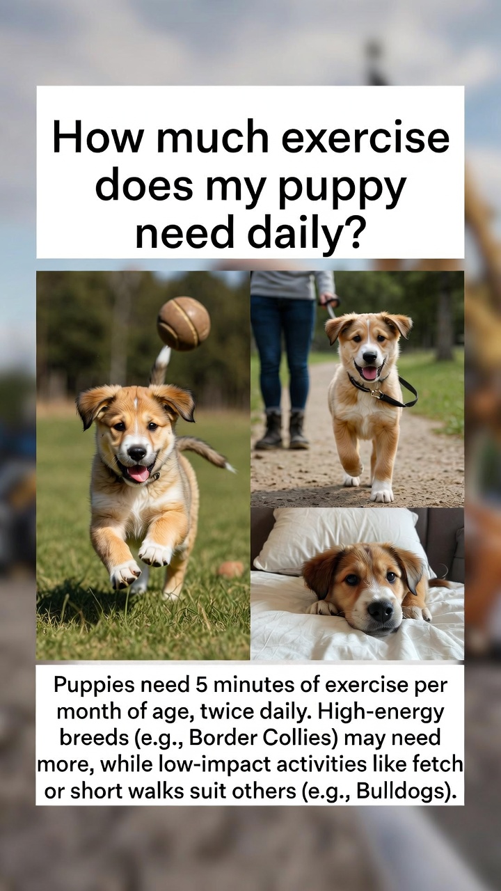 A common rule of thumb is about five minutes of structured exercise per month of age, once or twice a day, plus free play and mental activities. For example, a 4‑month‑old puppy might handle around 20 minutes of walking twice a day, as long as they seem comfortable and recover quickly. This is a guideline, not a strict rule, so always adjust based on how your puppy responds.