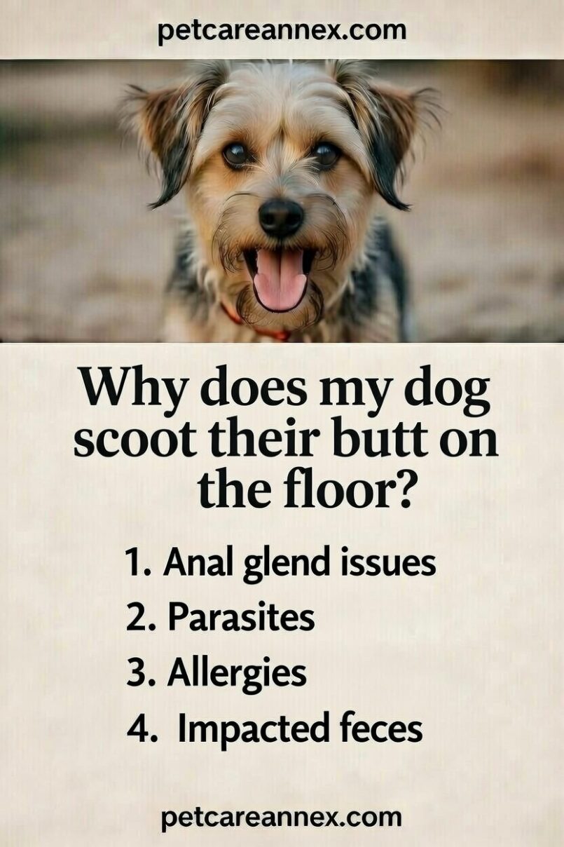 When a dog scoots their butt on the floor, it almost always means something is irritating or uncomfortable around their rear end, not that they are just being silly. The most common cause is trouble with the anal glands, but parasites, allergies, skin infections, and other problems can also be behind the behavior.